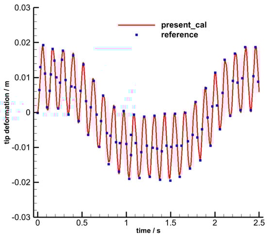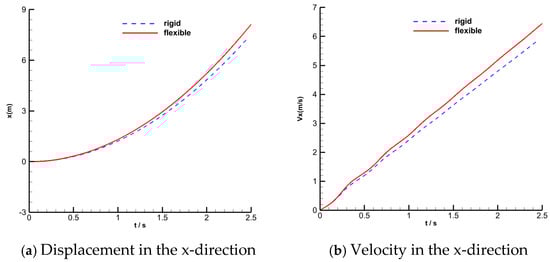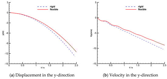 Figure 27 illustrate the displacement change in the centroid of the rigid model and the elastic model under the condition of releasing the centroid. As can been seen, the difference between the position of the center of mass of the rigid model and the elastic model increases over time, and for the x-direction, the elastic model increases in the windward area of the missile due to the bending deformation, so the aerodynamic force is slightly larger than that of the rigid model, which leads to the displacement in the x-direction being larger. Similarly, the occurrence of deformation in the y-direction causes the resulting additional force to overcome part of the gravitational force, resulting in a smaller decline in the y-direction in the elastic model than in the rigid model.