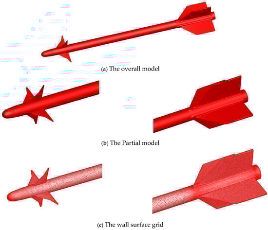 The missile model selected in this paper has a total length of 2.83 m, a diameter of 0.137 m, a slenderness ratio of 22.3, a wingspan of 0.63 m, a launch mass of 87 kg, and a maximum flight Mach number of 2.5. In the previous flutter validation of the AGARD 445.6 wing, although deviations existed between numerical results and experimental data at high Mach numbers, for the air-to-air missile model discussed in this section, the developed aeroelastic computational method remains feasible due to its small deformations. The simulation calculation model and mesh are shown in