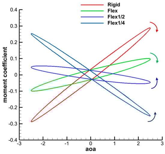 The hysteresis loop change in the pitching moment coefficient with the pitching angle of the rigid model and the model under different stiffness levels is presented in