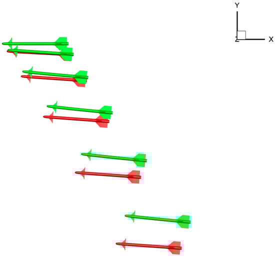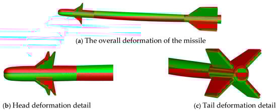 Figure 16 shows the deformation of the missile at a certain point in time, where red represents the rigid body model and green represents the elastomeric model; it can be seen that the deformation of the missile is mainly first-order bending.