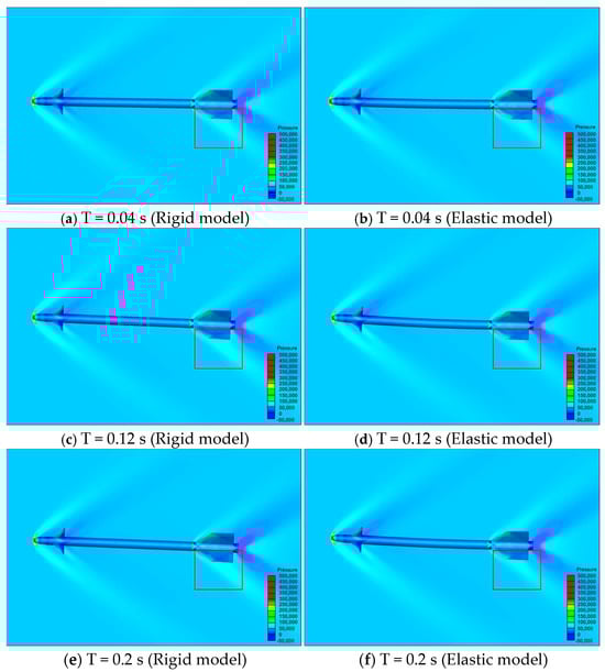 Figure 17, which presents both the pressure contour of the rigid model and the elastic model at different motion moments, due to the deformation, the pressure distribution of the rigid and elastic aircraft changes, and it can be seen that the shock area of the elastic model is smaller than that of the rigid model in the lower part of the tail.