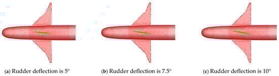 . The calculated Mach number of the incoming stream is 1.2, the flight altitude is 8 km, and the time step is 0.001 s. The initial rudder deflection angles are 5°, 7.5°, and 10°, and the rudder deflection is shown in
