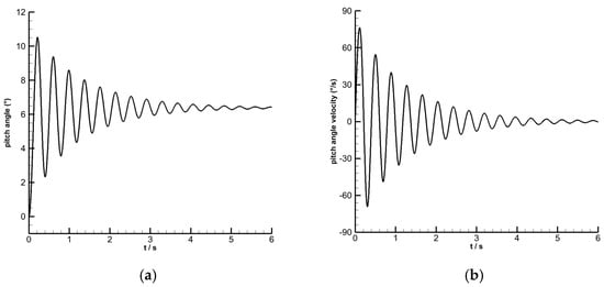 Figure 19 reveals the response history of the pitch angle and pitch angular velocity of the rigid model with an initial preset rudder surface declination angle of 10°; here, the calculation of the pitch angle is based on the center of mass as the reference point. From the pitch angle and angular velocity response, it can be observed that the rigid model experiences a significant nose-up moment at the initial stage, generating an upward angular velocity that causes it to deviate from the equilibrium position; subsequently, it exhibits an oscillatory convergence trend over time and eventually stabilizes at a fixed equilibrium angle. This phenomenon occurs because the aerodynamic center of the rigid model is positioned ahead of its center of mass, leading to aerodynamic damping effects during the pitch motion.