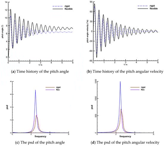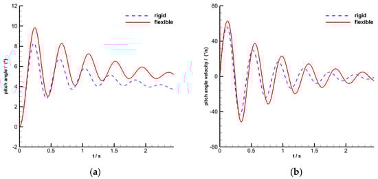 Figure 20a,b compare the pitch/angular velocity of the rigid model and the elastic model, and