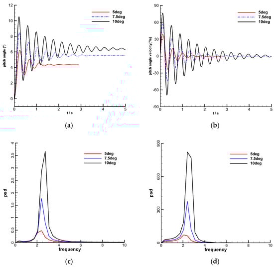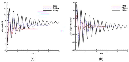 Figure 22 shows the variation in the pitch angle and the pitch angular velocity of the rigid model under the three preset rudder declination angles. When the rudder angle is 5°, the equilibrium angle is minimized at 4.3°; at a rudder angle of 7.5°, the equilibrium angle is 5.5°; and at a rudder angle of 10°, the equilibrium angle reaches its maximum value of 6.5°, the equilibrium angle of attack for the three rudder deflection angles differs by approximately 1°. It can be seen that for the rigid model, the larger the preset rudder deflection angle, the faster the response of the pitch motion of the aircraft, the more time it takes to reach the convergence state, and the larger the convergence angle when the equilibrium state is finally reached. At the same time, the spectrum analysis reveals that as the rudder deflection angle increases, both the amplitude and dominant frequency of the pitch angle response also increase, and the higher dominant frequency results in a shorter response period.