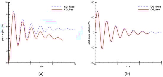 Figure 25, it presents the variation in the pitch angle and pitch angular velocity of the centroid fixation and centroid release in the case of rigidity. It can be seen that when the center of mass is fixed, the final attenuation of the pitch angle converges to an equilibrium angle; however, for the release of the center of mass, although the amplitude of the pitch angle is also gradually attenuated, it finally no longer has a balanced pitch angle, and observing the pitch angular velocity, it is found that the pitch angular velocity is always less than the fixed center of mass when the center of mass is released, which is due to the downward washing effect produced by the movement of the centroid. So, it is necessary to balance the pitching moment by bowing the head.