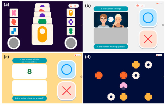 The content used in digital therapeutic interventions is fundamentally designed with a level-based difficulty tailored to the abilities of the target individual [15]. Problem-solving abilities are evaluated based on criteria such as accuracy rates or the time required to complete tasks, and progression to the next level is determined accordingly. Therefore, during the development process, content levels are established by designing components to improve memory, attention, and focus. These components are evaluated in relation to the performer’s outcomes, and their information-processing abilities are assessed to determine progression [16].