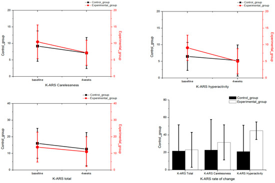 After adjusting for baseline effects, the experimental group that received the story-based intervention showed a significantly greater reduction in K-ARS hyperactivity–impulsivity and K-ARS total scores than the control group at the four-week follow-up (p = 0.018 and p = 0.012, respectively). Furthermore, the change rates for the K-ARS hyperactivity–impulsivity and K-ARS total scores were significantly higher in the experimental group (p = 0.002 and p = 0.025, respectively; Figure 4).