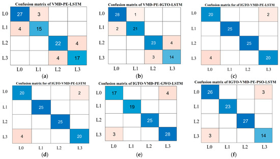 To verify the applicability of the IGTO-VMD-PE-IGTO-LSTM model on this dataset, it was compared with a series of benchmark models, including VMD-PE-LSTM, VMD-PE-IGTO-LSTM, GTO-VMD-PE-LSTM, IGTO-VMD-PE-LSTM, IGTO-VMD-PE-PSO-LSTM, IGTO-VMD-PE-GWO-LSTM, IGTO-VMD-PE-CDO-LSTM, IGTO-VMD-PE-GTO-LSTM, GWO-VMD-PE-IGTO-LSTM, PSO-VMD-PE-IGTO-LSTM, GTO-VMD-PE-IGTO-LSTM, and CDO-VMD-PE-IGTO-LSTM. The parameter settings used were consistent with those described in Section 4.2. To mitigate the randomness introduced by intelligent optimization algorithms in the fault diagnosis process, each model was executed 10 times. The classification accuracies obtained in the testing phase are summarized in Table 9 below.