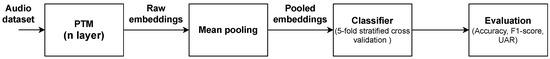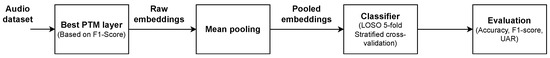 where corresponds to the feature vector at time step t. This operation compresses the sequence into a single vector, facilitating compatibility with downstream classifiers. Mean pooling has been consistently employed in SER tasks involving PTM embeddings [52,54,80], offering a simple yet effective way to aggregate temporal information. Models like CLAP and TRILLsson are excluded from this step, as they already integrate internal mechanisms for temporal summarization or lack a sequential structure altogether.