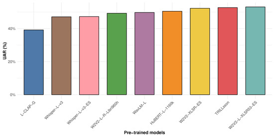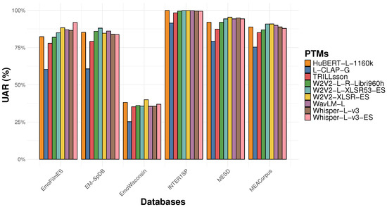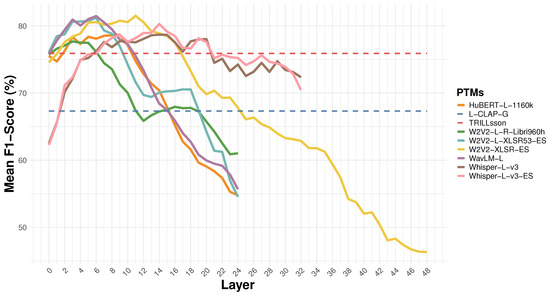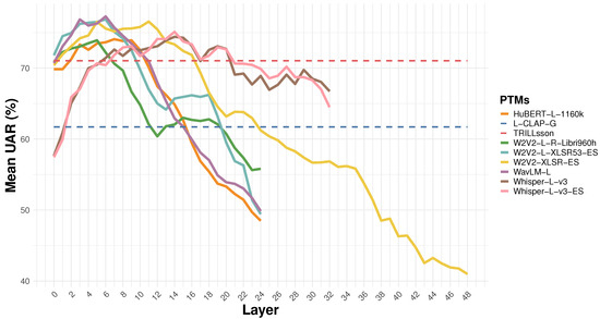 Table 4 presents a summary of the performance results of the PTMs evaluated on each of the databases. This table shows the best score achieved (accuracy, F1-score, and UAR) by each classifier employed, where the subscript indicates the hidden layer corresponding to the obtained score.
