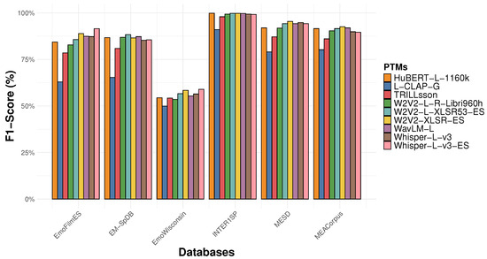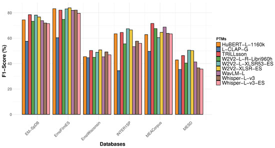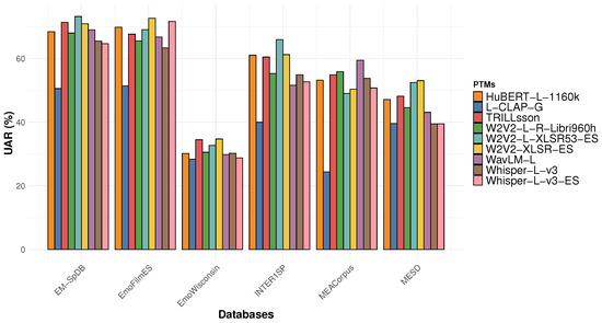 Based on the highest values (highlighted in bold in Table 4), we observe that the INTER1SP database achieves the highest scores using the HuBERT-L-1160k PTM and SVM classifier, achieving an accuracy of 99.83%6, an F1-score of 99.83%6, and a UAR of 99.88%6. The MESD database also has a high performance with the W2V2-XLSR-ES PTM and MLP classifier, achieving 95.38%6 in accuracy, 95.40%6 in F1-score, and 95.38%6 in UAR. The database achieves 91.67%22 in accuracy, 91.52%22 in F1-score, and 91.83%22 in UAR, using Whisper-L-v3-ES PTM and the MLP classifier. In contrast, the EmoWisconsin database, due to its complexity and limited emotional range, shows lower and unstable performance. Its best accuracy is 62.50%15 and is achieved by W2V2-XLSR-ES and SVM, while the highest F1-score is 58.92%31 and is obtained by Whisper-L-v3-ES and MLP, and the highest UAR is 40.0%14 and is observed by W2V2-XLSR-ES and MLP.
