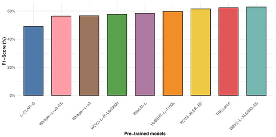 - HuBERT.HuBERT [45] is a PTM developed by Facebook, with a fully transformer-based architecture. This model has been trained on 1,160,000 h of unlabeled audio data using a self-supervised learning paradigm similar to Wav2Vec 2.0, but optimized for mask prediction tasks within audio signals. In this study, a 24-layer, 316 million-parameter version has been employed facebook/hubert-large-ll60k (HuBERT-L-1160k).