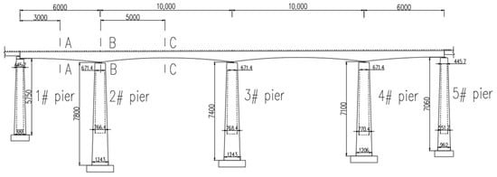 The girder is constructed using C50 concrete, with a Poisson’s ratio of 0.2. The bridge is supported by rectangular thin-walled piers measuring 57.5 m, 78 m, 74 m, 71 m, and 70.5 m, made from C30 concrete, which also has a Poisson’s ratio of 0.3. The longitudinal and transverse prestressing strands consist of 1x7-15.2-1860-GB/T5224-2003 [22] prestressing strands, featuring a standard strength of 1860 MPa and a modulus of elasticity of Ey = 1.95 × 105 MPa. For vertical and lateral prestressing, 25 high-strength fine-rolled rebars with a standard strength of 785 MPa are utilized.