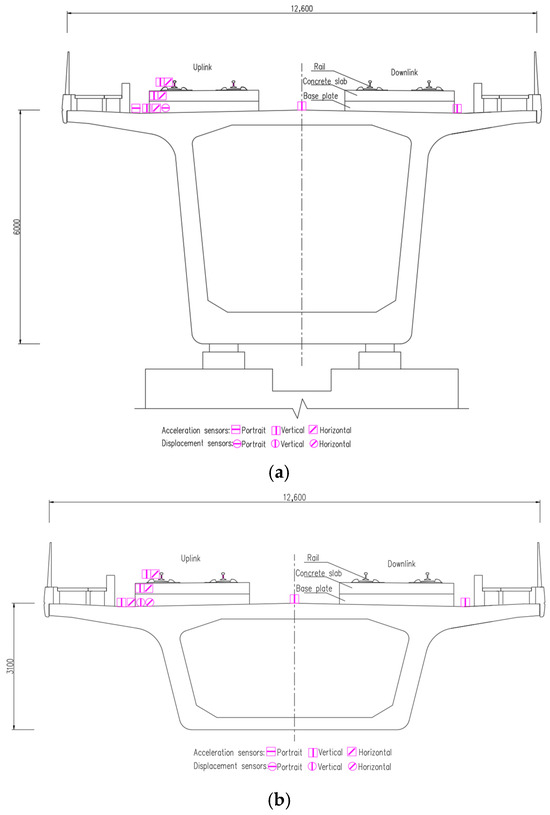 The Jianxi Bridge was selected as the test bridge, the 60 m span midspan section is defined as Section A, the 60 m span and 100 m span connected pier section is defined as Section B, and the 100 m span midspan section is defined as Section C, as illustrated in Figure 2. The measurement points of each section were arranged at the rail, concrete slab, and bridge deck, as shown in Figure 3. The arrangement of the measurement points was consistent in Sections A and C.