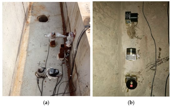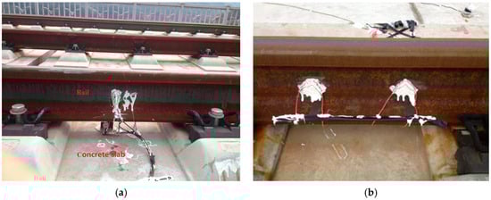 Measurements on the track: (a) acceleration sensors on the rail and concrete slab; (b) strain gauges on the rail.