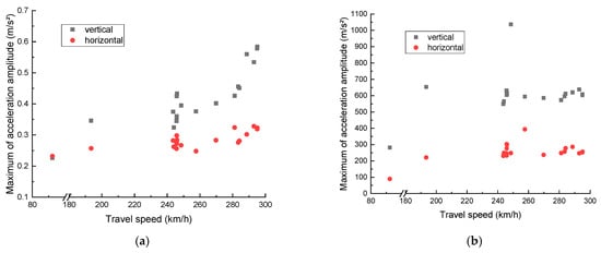 - In the measurement points of concrete slabs and decks, after the vehicle speed reaches 240 km/h, the acceleration response increases with the increase in vehicle speed, and there is a resonance phenomenon with a significant increase in response at the measurement point of the girder end cross-section, where the vehicle speed is about 245–250 km/h. When the track structure is optimized and maintained, in addition to the self-oscillation frequency of the structure that should be avoided, the line level, the speed range of the train on the line, and other factors should also be considered so that the corresponding main frequency of the track structure under the train running speed is avoided to ensure that the damage brought by resonance to the track structure is reduced.