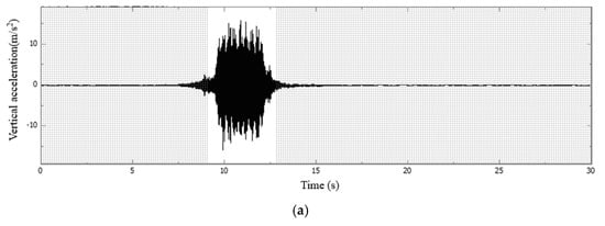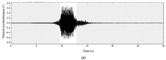 Taking the concrete slab and bridge deck of Section C as examples, the acceleration signal time–frequency diagrams are illustrated in Figure 7, Figure 8, Figure 9 and Figure 10.