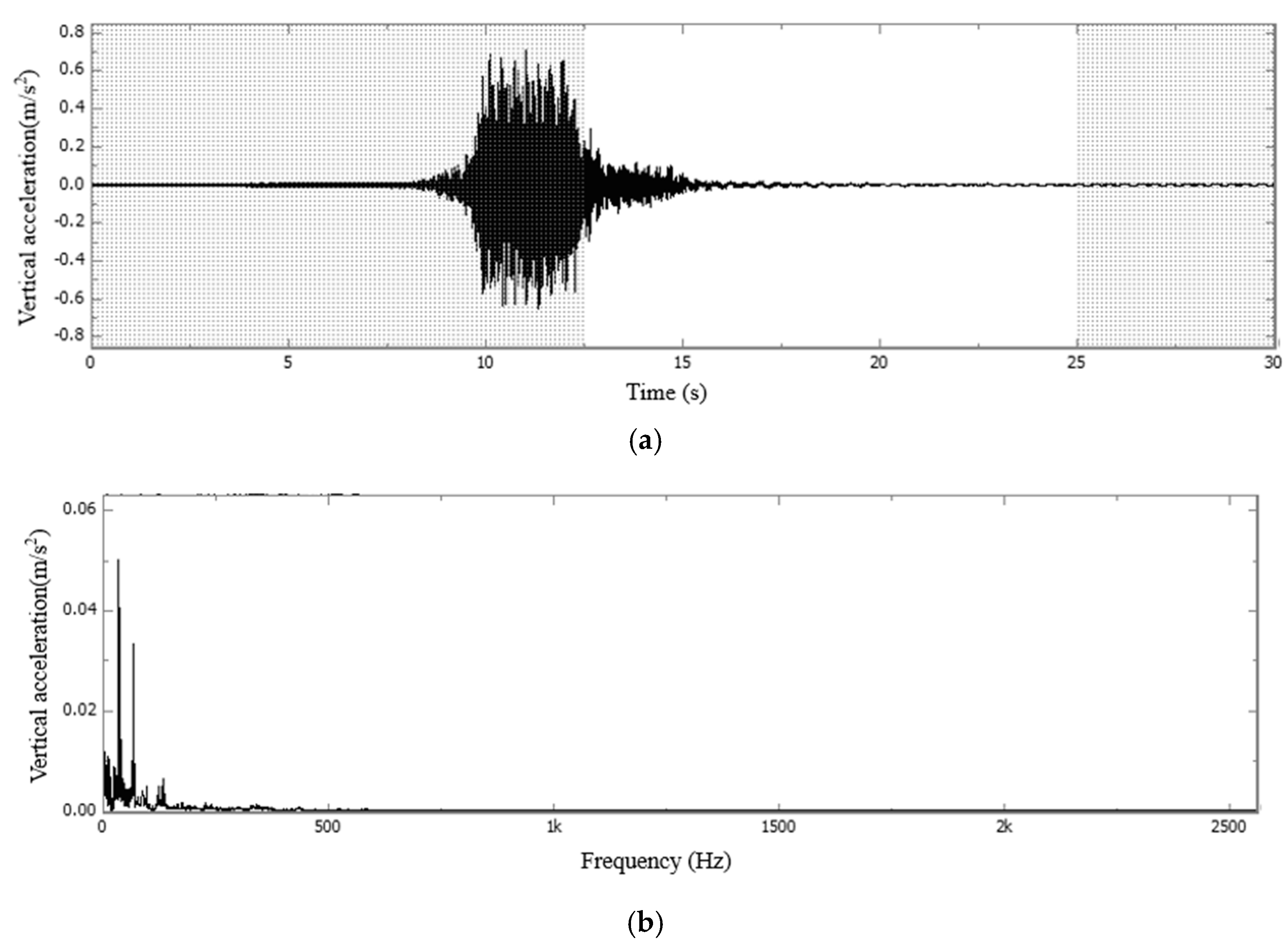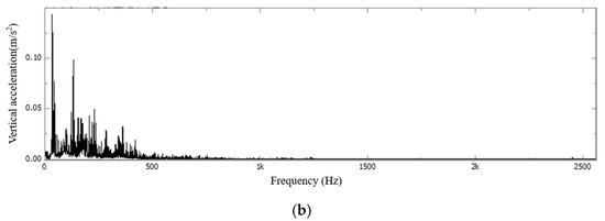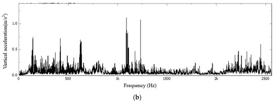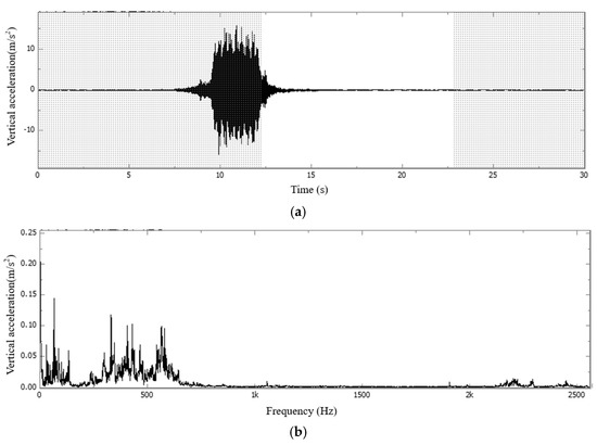 FFT time−frequency diagram of vertical acceleration during the vehicle-induced vibration phase of the concrete slab in Section C: (a) waveform diagram; (b) single peak spectrum.
