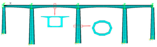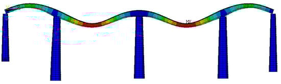 The bridge dynamic simulation model is established by ANSYS, in which the “BEAM188 element” is used to simulate the superstructure of the bridge, and the “BEAM44 element” is used to simulate the pier part; the constraint condition of the beam pier support is handled by the master-slave node [23,24,25]. The finite element model of the constructed bridge is shown in Figure 13. Its vertical first-order vibration pattern is shown in Figure 14.