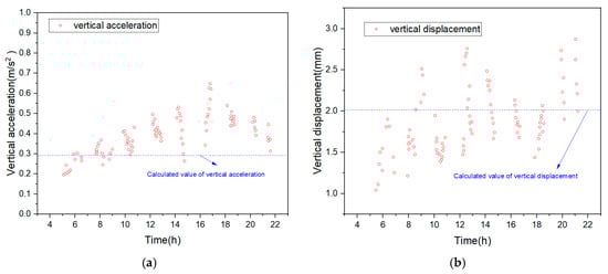 As can be seen from the above figure, the measured values of vertical acceleration and displacement of the continuous beam show an overall upward trend during the day, and the measured values are larger in the time period from 12 to 15 pm. The calculated values of vertical acceleration and displacement in Section C are 0.293 m/s2 and 2.061 mm, which are all within the distribution range of the measured values in the dynamic test, indicating that the theoretically calculated values are more in line with the measured values, and verifying the reliability of the train–bridge system.