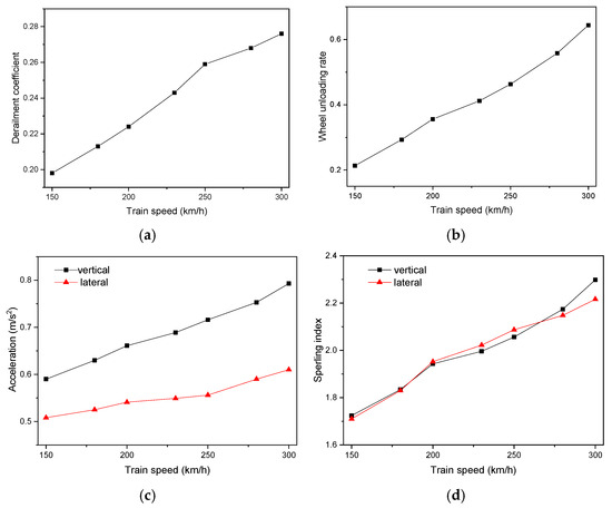 In the speed range of 150–300 km/h, the maximum dynamic response indices of the vehicle vary with train speed, as shown in Figure 16.