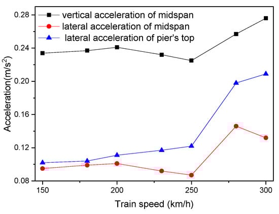 Figure 17 and Figure 18 show that the dynamic responses of the bridge increase with train speed. The acceleration of the midspan has a greater change range than the displacement, indicating that it is more sensitive to the change in train speed. The lateral acceleration of the pier’s top increases with the increase in vehicle speed. When the vehicle speed is 300 km/h, the lateral acceleration of the pier’s top increases obviously.