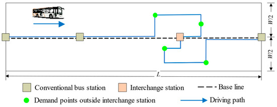 In the absence of flexible travel demand, FRT operates like a conventional bus, adhering to a fixed route and station stops. Upon reaching the interchange station area, FRT can dynamically pick up or drop off passengers from the base route, effectively completing the “first/last mile” segment of their journey. As shown in Figure 1, there are two types of passengers in the L × W service area. Type I passengers: transfer from the subway station (Origin) to the flex-route transit and then reach the demand point (Destination); Type II passengers: from the demand point (Origin), board the flex-route transit to the subway station (Destination) and then enter the subway station.