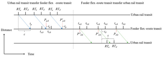 For the two cases of urban rail transit transfer feeder flex-route transit and feeder flex-route transit transfer urban rail transit, the optimal transfer conditions are as follows: When passengers transferring from urban rail transit to feeder flex-route transit arrive at the bus station, the feeder vehicle is already at the station, allowing passengers to transfer without waiting. Similarly, when passengers arrive at the urban rail platform, the train is already at the station, and they can board without delay. This transfer process can be illustrated in a time–space diagram, as shown in Figure 2.