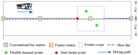 The flex-route transit departure interval is calculated when the vehicle arrives at the feeder service area along the base line, as shown in Figure 3. During the operation of the flex-route transit, the departure interval is constrained by the time interval [Hmin, Hmax] (the lower and upper limits of the vehicle departure interval). The determination of the departure interval in different periods can be calculated according to the model.