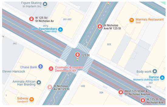 This section selects the St Nicholas Av/W 125 St station of the M3 bus line and the 125 St station of the subway A/B line in Manhattan, New York as examples to verify the model and algorithm based on operational data such as traffic flow, lines, and timetables, as shown in Figure 4. In the feeder service area, the M3 route is converted into a flex-route transit system, enabling vehicles to deviate from the baseline to accommodate passengers with flexible travel demands.