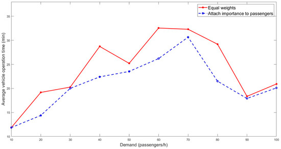 Table 2 shows that when passenger demand is high and service frequency is relatively low, the average vehicle running time increases. However, since increasing service frequency raises operating costs, this scheme represents the optimal solution under these conditions. If greater emphasis is placed on passenger waiting costs and late arrival time, the average vehicle running time and system running cost under different demand levels will also change, as shown in Figure 5 and Figure 6.