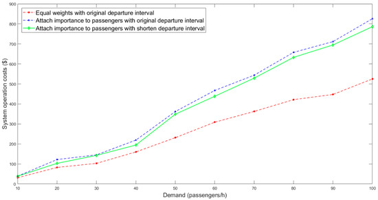 In Figure 6, “Equal weights with original departure interval” represents the total operating cost of the system under the default weight values, which aligns with the data presented in Table 2. “Attach importance to passengers with original departure interval” refers to the system operating cost at the original departure interval under adjusted weight values. “Attach importance to passengers with short departure interval” represents the system operating cost when the departure interval and average vehicle running time are reduced accordingly.