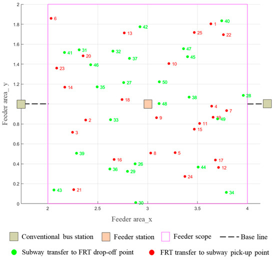 Specifically, the routine simulation verification is based on a passenger demand level of 50 people per hour, as shown in Figure 7. In the figure, red dots represent origins where passengers transfer from flex-route transit to the subway, while green dots indicate destinations where passengers transfer from the subway to flex-route transit. The subway arrives and departs from the interchange station every 10 min between 7:00 and 7:59, while flex-route transit departs from the feeder area boundary at 7:00. The departure interval and corresponding system operating parameters are computed by prioritizing passenger-related considerations.