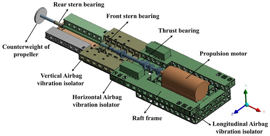 A certain elastically supported submarine shafting mainly consists of a propeller, two stern bearings, a thrust bearing, and several couplings. The stern bearings operate with water lubrication, while the thrust bearing is oil-lubricated. A large flexible raft frame was taken as the supporting foundation of the shafting and the propulsion motor, as shown in Figure 1. There are airbag vibration isolators arranged symmetrically at the vertical, horizontal, and longitudinal directions of the raft frame.