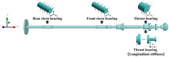 The trial vertical stiffness of the rear stern bearing and front stern bearing was set to 2.0 × 105 N/mm and 1.7 × 105 N/mm, respectively, and the lateral stiffness was set to 1.2 × 105 N/mm and 1.1 × 105 N/mm, respectively. For the thrust bearing, the trial vertical, lateral, and axial stiffness were set to 2.0 × 105 N/mm, 1.7 × 105 N/mm, and 1.2 × 106 N/mm, respectively. The measured and calculated bearing load values are listed in Table 1.