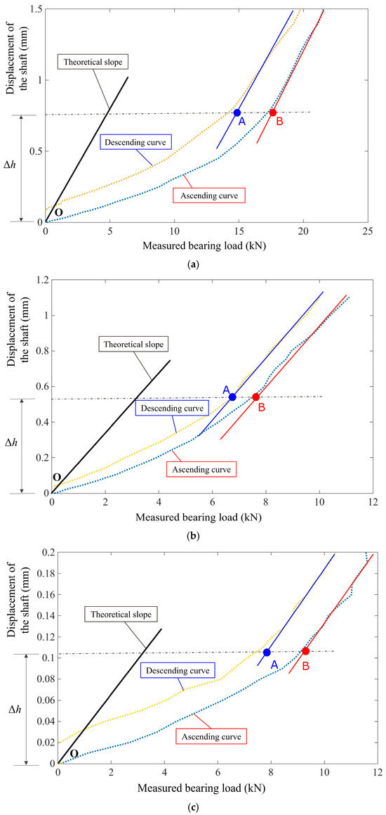 Within the range of , curve segment OB represents the ascent phase from the start of jacking to the state that the tested bearing is totally unloaded, while AO represents the descent phase from the first contact between the journal and the tested bearing to the state that the jack is totally unloaded. The actual measured load and the validity constraint of the tested bearing are:
