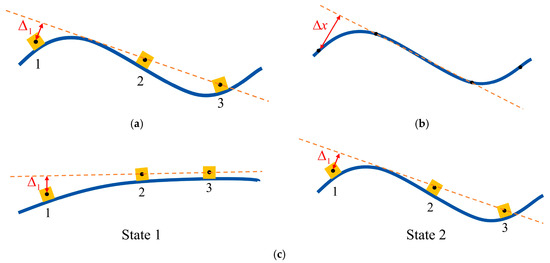 To address the limitations mentioned above, this study proposes an equivalent line-surface method to measure the elastic deformation of the raft frame and the bearing displacement induced by it. The equivalent surface of the raft frame was obtained by the robust weighted total least squares method [23,24] to measure the elastic deformation, as illustrated in Figure 5a, and the deflection state of the centerline of the bearing housings was fitted by the polynomial fitting method [25] to measure the bearings’ displacement characteristics, as illustrated in Figure 5b.