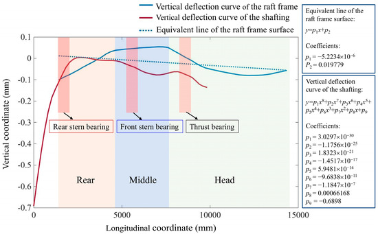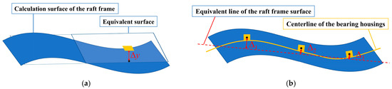 In the equivalent line-surface method, nodal coordinates on the raft frame surface are first extracted; then, the robust weighted total least squares method is used to derive the equivalent surface. The positional difference on the equivalent surface before and after displacement represents the rigid displacement of a certain node on the raft frame, and the shortest spatial distance between the nodes on the raft frame and the equivalent surface represents the elastic deformation of the raft frame, as shown in Figure 5a. Taking the centerline of the bearing housings as the reference baseline, the coordinates of each point along the line were used by the linear regression method to fit another centerline that can measure the displacement changes of the bearings, namely the equivalent line of the raft frame surface, as shown in Figure 5b. The displacement difference between a bearing and this equivalent line represents the displacement change of this bearing. This method enables the transformation of the absolute displacement obtained from finite element calculation to the displacement variations of the equivalent supporting points of the bearings, thereby obtaining the accurate elastic displacements of the bearings. In practical applications, the fitting accuracy can be enhanced by expanding the number of sample points, which ensures the measurement precision of the elastic displacement. Figure 6 shows the deflection curves of the shafting and the raft frame surface in the initial installation state, as well as the fitted equivalent line.