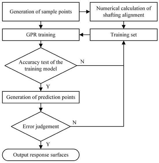 - Use the GPR to train the regression equation, and test the accuracy of the training model with newly generated sample points. The test method is used to calculate the average relative error of each bearing load, with the requirement that the load error of the stern bearings should not exceed 5%, while that of the thrust bearing should not exceed 1%.