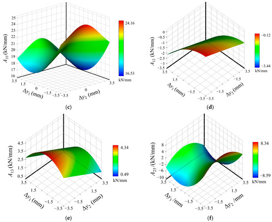 Figure 8d–f show the response surfaces between , , and , . It can be seen that there is a weak coupling between the load of the rear stern bearing and the front stern bearing. When or is individually adjusted, exhibits minimal variation characterized by an approximately linear trend. It can be found from Figure 8e,f that the load characteristics between the stern bearings and the thrust bearing are highly coupled. The displacements of the stern bearings, especially for the front stern bearing, significantly influence the load of the thrust bearing, making the BLINs transit from positive to negative within a small displacement range. Therefore, the variation law of the influence number of the thrust bearing about itself was further analyzed, as shown in Figure 9.