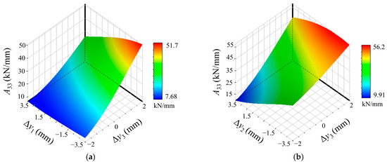 According to Figure 9a, when = −2 mm, changes linearly with . With the increase in , the decreasing amplitude of with the elevation of the rear stern bearing increases significantly, indicating an obvious positive coupling between , and the load of the thrust bearing. According to Figure 9b, when = −2 mm, decreases significantly with the increase in . With the increase in , the decreasing amplitude of with the elevation of the front stern bearing decreases significantly, indicating an obvious negative coupling between , and the load of the thrust bearing. With the variation in and , the maximum value of is 56.2 kN/mm, suggesting that the amplification effect of the coupling of and on is bigger than that of alone. The displacement of the front stern bearing will lead to an obvious load change of the thrust bearing.