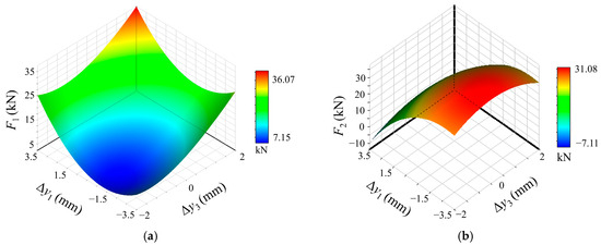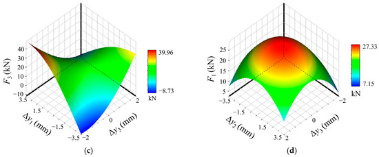 In order to intuitively reflect the relationship between bearing loads and bearing displacements, some of the response surfaces between bearing reaction forces and bearing displacements are shown in Figure 10.