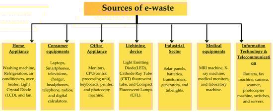 The amount of e-waste is increasing due to driving factors such as urbanization, growing disposable incomes, enhanced mobility, industrialization, and the rapid development of information and technology [3]. Advances in science and technology have also increased consumer demand for electronic products, further amplifying this issue [4]. Figure 1 illustrates various sources of e-waste generation.