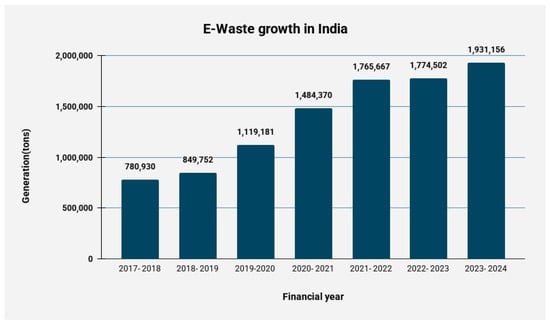 India is the world’s third-leading producer of electronic waste, followed by China and the US [20,21]. Yearly, the country distributes more than 14 million refrigerators, 17 million televisions, 148 million cell phones, 19 million pieces of sound equipment, and approximately 6.5 million washing machines. Electronic waste production increased by 0.63 Mt in the financial year 2017–2018 to 1.6 Mt in the financial year 2021–2022. The anticipated pattern will persist, with an estimation of close to 14 Mt of electronic waste produced annually by 2030 [20,21].
