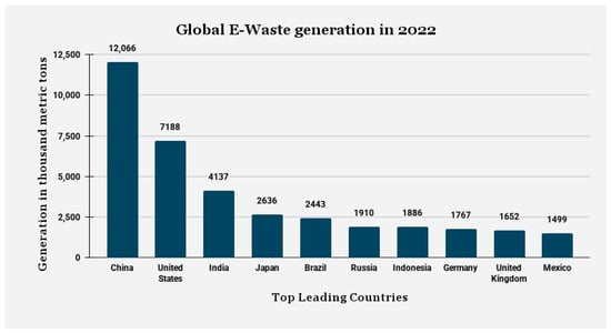 Top leading counties based on e-waste generation in 2022 (based on data https://www.statista.com/statistics/499952/ewaste-generation-worldwide-by-major-country/ (accessed on 5 January 2025)).