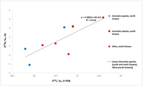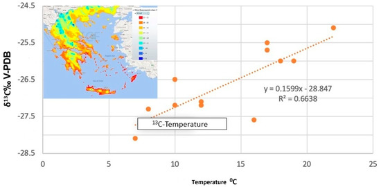 | Kiato, South Gr | 38.01 | 22.75 | Citrus, Rutaceae family. OF | 12.1 | −25.9 | 5.1 |