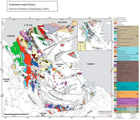 - Papanikolaou, D. The Geology of Greece; Regional Geology Reviews Series; Springer: Dordrecht, The Netherlands, 2021. [Google Scholar] [CrossRef]