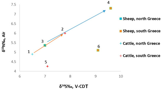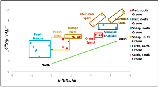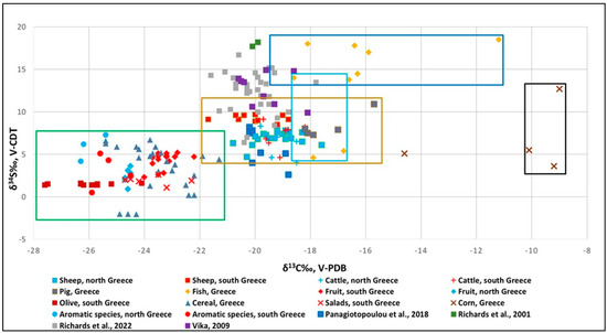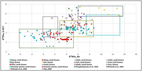 Karalis, P.; Dotsika, E.; Poutouki, A.-E.; Diamantopoulos, G.; Gkelou, L.; Kyropoulou, D.; Bellas, S.; Gamaletsos, P.N. Isotopic Analysis (δ13C, δ15N, and δ34S) of Modern Terrestrial, Marine, and Freshwater Ecosystems in Greece: Filling the Knowledge Gap for Better Understanding of Sulfur Isotope Imprints—Providing Insights for the Paleo Diet, Paleomobility, and Paleoecology Reconstructions. Appl. Sci. 2025, 15, 4351. https://doi.org/10.3390/app15084351