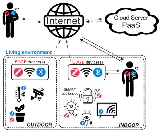 A device must operate both on a local network either as a client or a server (or both) and be connected to the Internet for an additional level of control and data access. Additional ports and connection points are needed to establish wired communication with devices that are controlled by the edge device. Functional elements of an example IoT hardware and software concept are described in [25]. The edge device must be able to communicate with several sensors or other devices via integrated communication protocols (such as Zigbee, Bluetooth, or Wi-Fi).